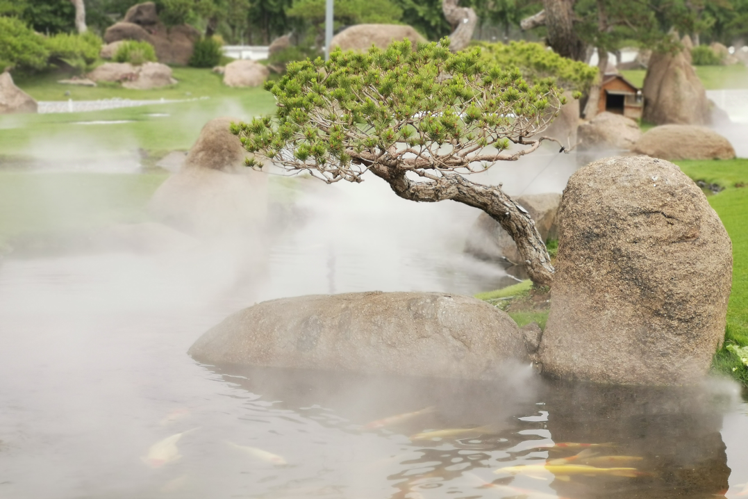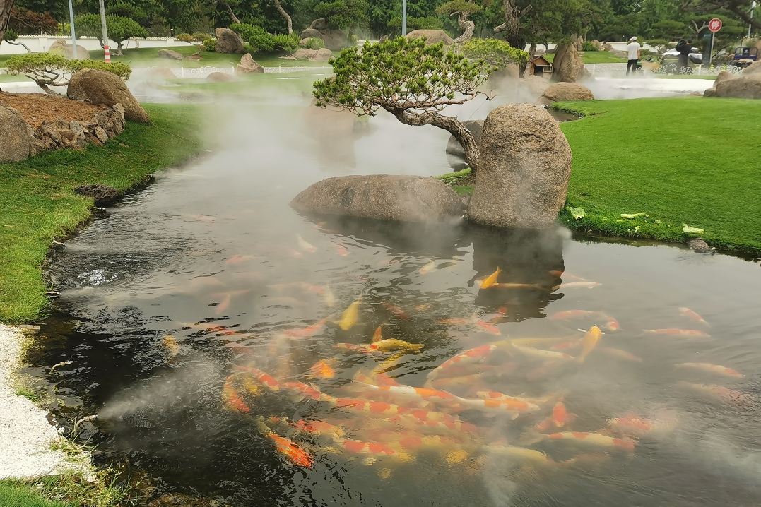 在韩国园林世家传人设计的东方园林景观中,湖面的黑天鹅及各色锦鲤游曳在湖中,与周围园林风景相映成趣,在湖面弥漫的层层雾气下若隐若现。静坐在湖边,品尝着罗红先生品牌蛋糕店的甜品,我感受到一种内心的平静,也许这就是生命与自然带来的美吧。