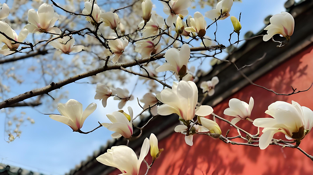 在天坛红墙的衬托之下,雪白的玉兰花像一位翩翩起舞的姑娘,令人赞叹不已。有人说它是春天的偏爱,当其他的花儿们还羞涩着沉睡时,它啪地一声绽放,“日晃帘栊晴喷雪”。