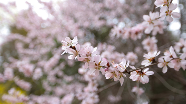远看,一个个桃花仙女们在微风中轻盈地舞蹈;近看,修长的枝条上,密密匝匝的花朵在春天里轻轻摇曳着,仿佛在向人们点头致意。