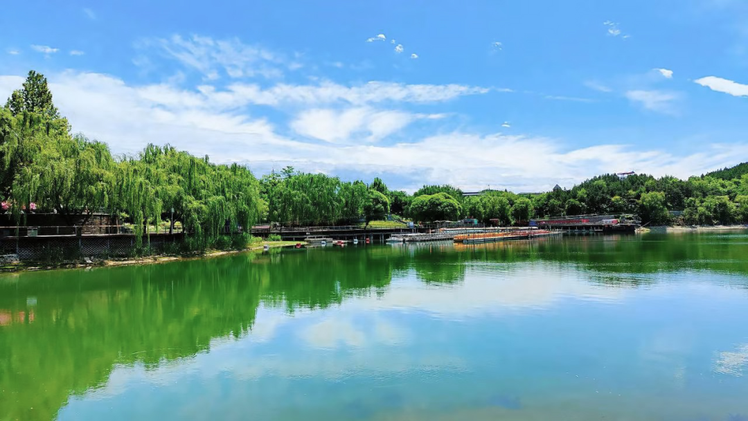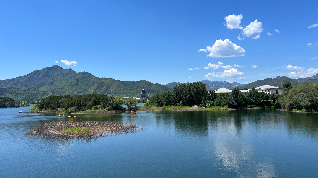 碧蓝如洗的晴空下,雁栖湖似一块美玉,远处青山黛绿,近处轻舟摇曳,美不胜收。坐上游船划进湖中央,阳光洒落在湖面上波光粼粼,耳边只剩下荡漾的湖水声,让人享受难得的清凉与静谧。