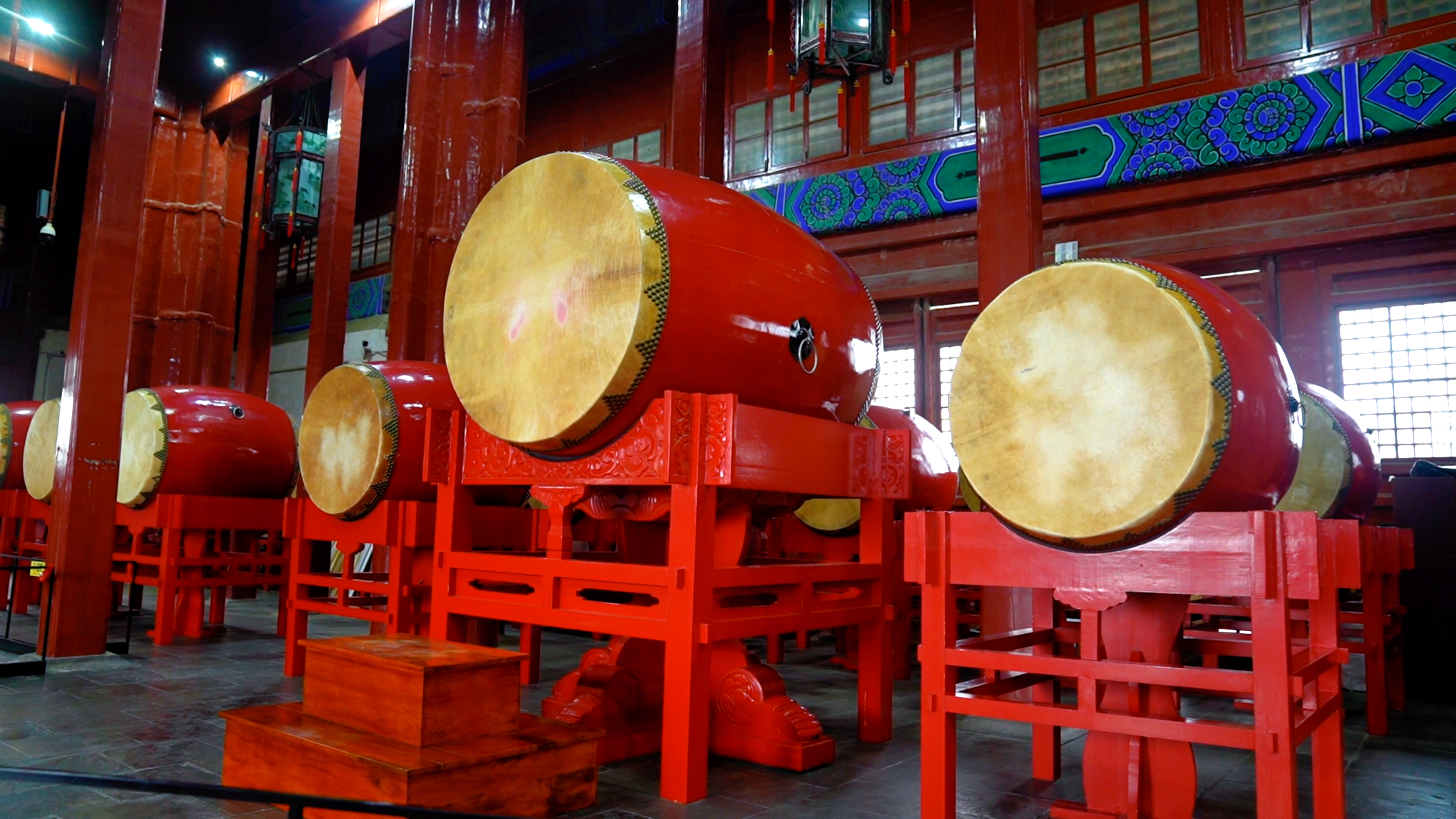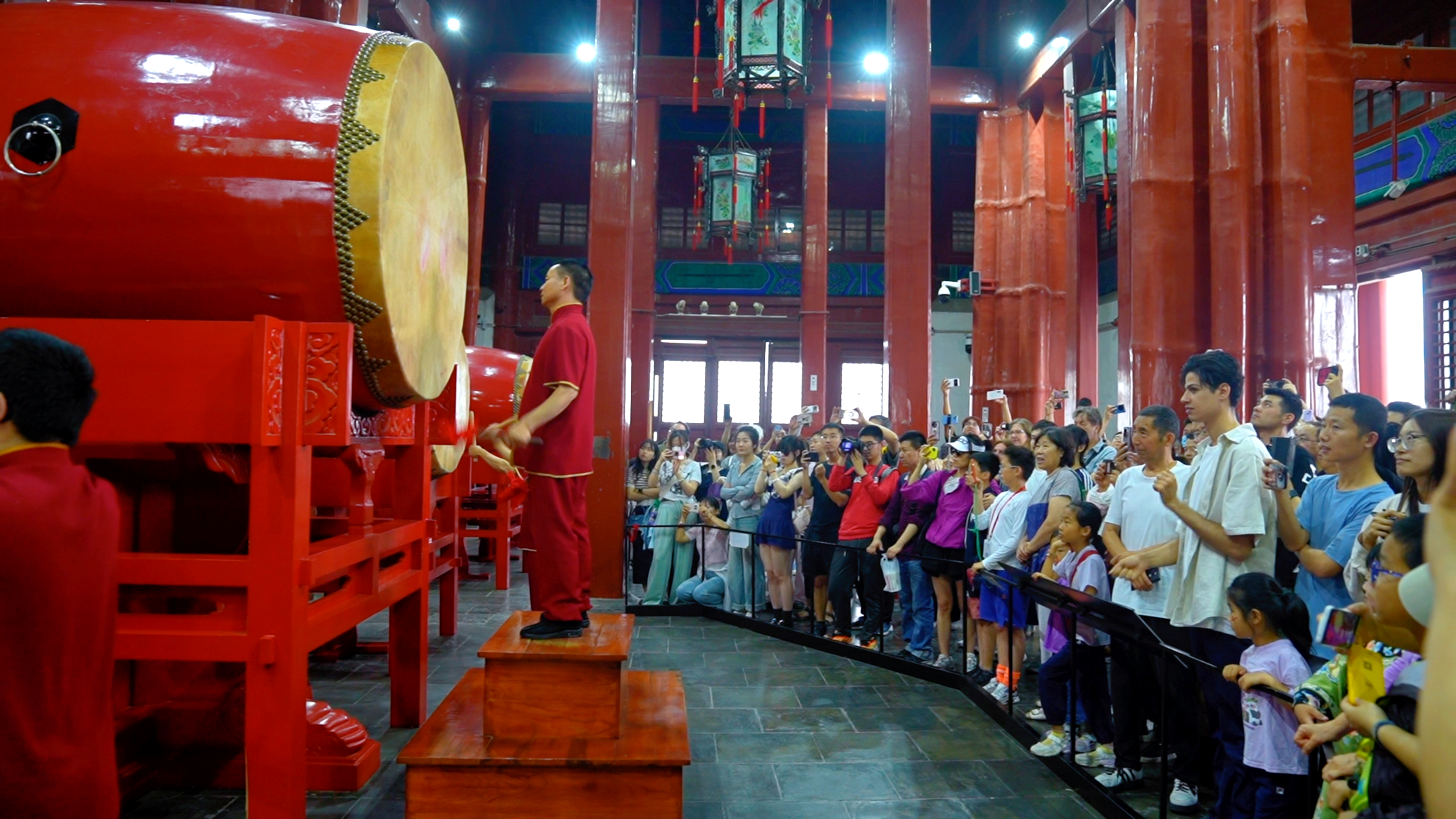 跟随范大爷登上46.7米高的鼓楼,刘正曦俯瞰着中轴线,它如同巨龙贯穿南北,象征着城市的灵魂与历史沉积。如今,鼓楼内仍存放着25面大鼓,并会定期举办击鼓表演,响亮振奋的鼓声成为游客们的热门打卡项目。