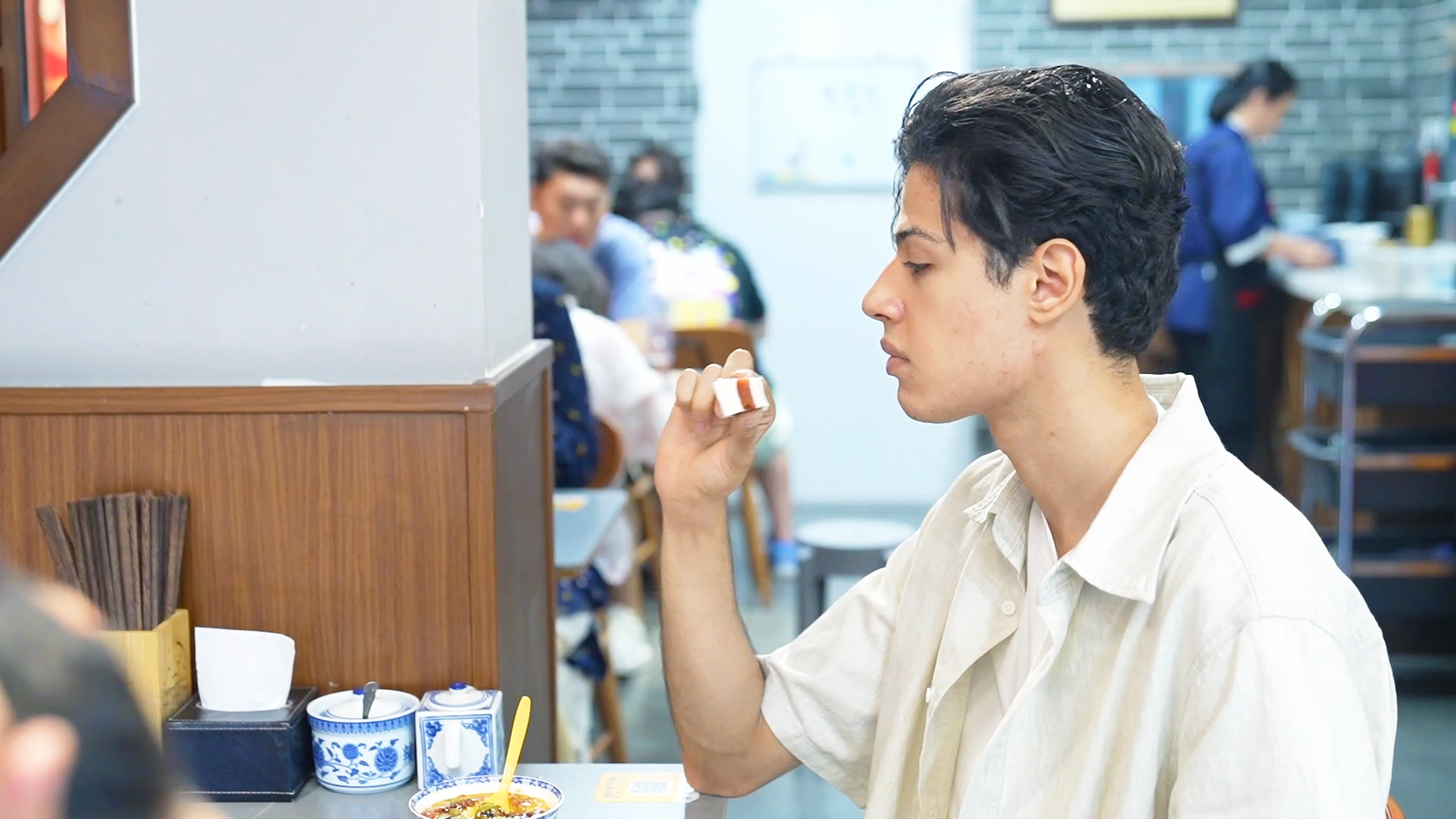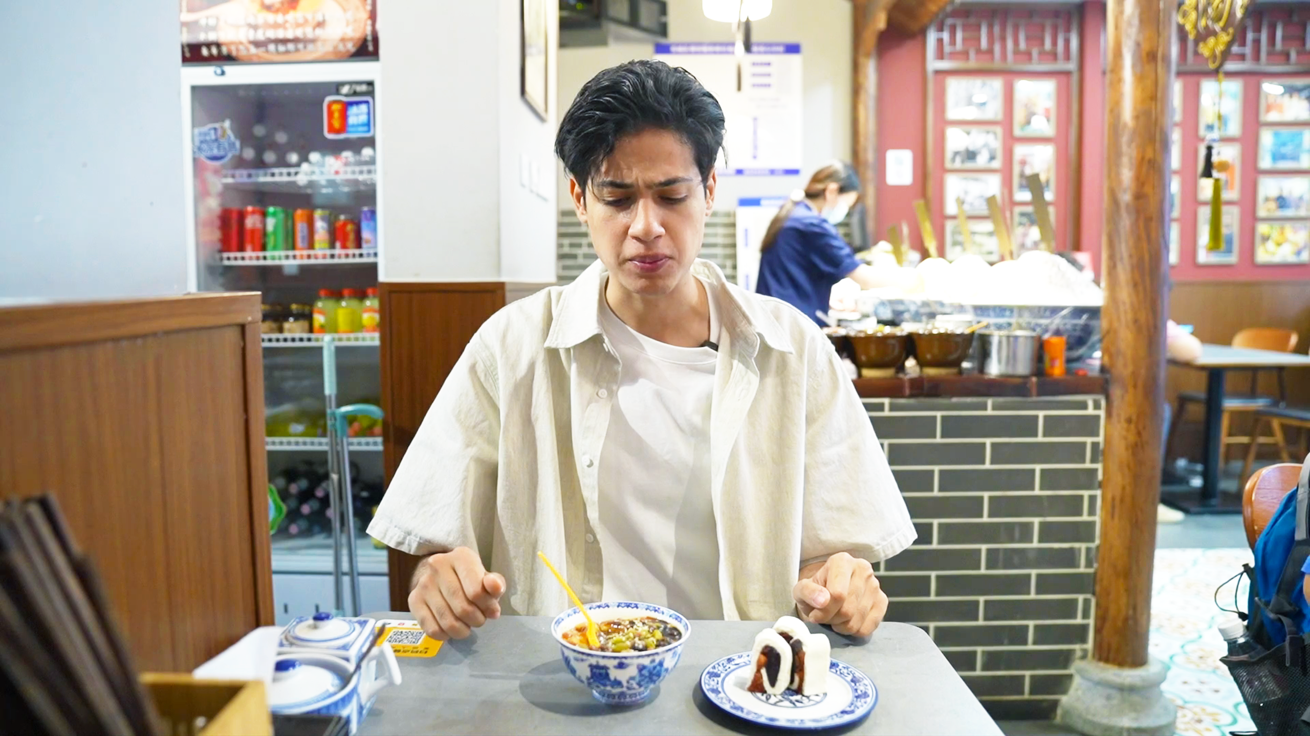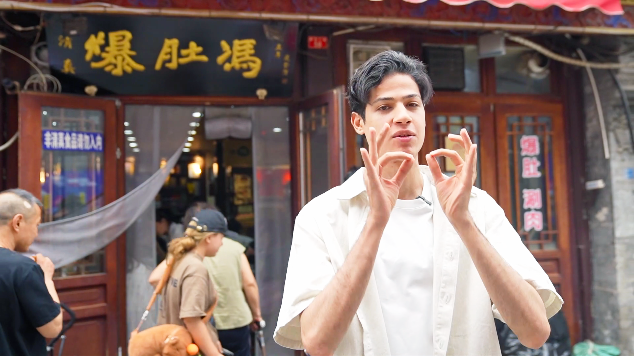 正阳门俗称“前门”,这儿的大栅栏汇聚了众多特色美食,著名的“爆肚冯”正是刘正曦即将品尝的美味。爆肚冯的历史可以追溯至清朝,因其独特的爆肚烹饪技艺闻名遐迩。刘正曦点了著名的水爆牛百叶和芝麻烧饼,配上水爆调料,准备大快朵颐。