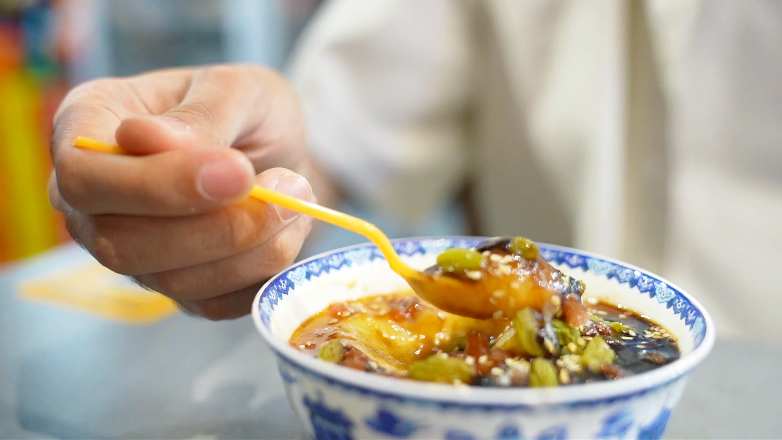 经过神武门来到中轴线北端的鼓楼,刘正曦打算以一份正宗的北京下午茶,为这趟美食之旅画上完美的句号。茶汤是北京的特色小吃,主要由高粱米面和糜子面制成,搭配青红丝、芝麻、核桃仁、葡萄干等配料,因其冲泡方式类似沏茶而得名。
