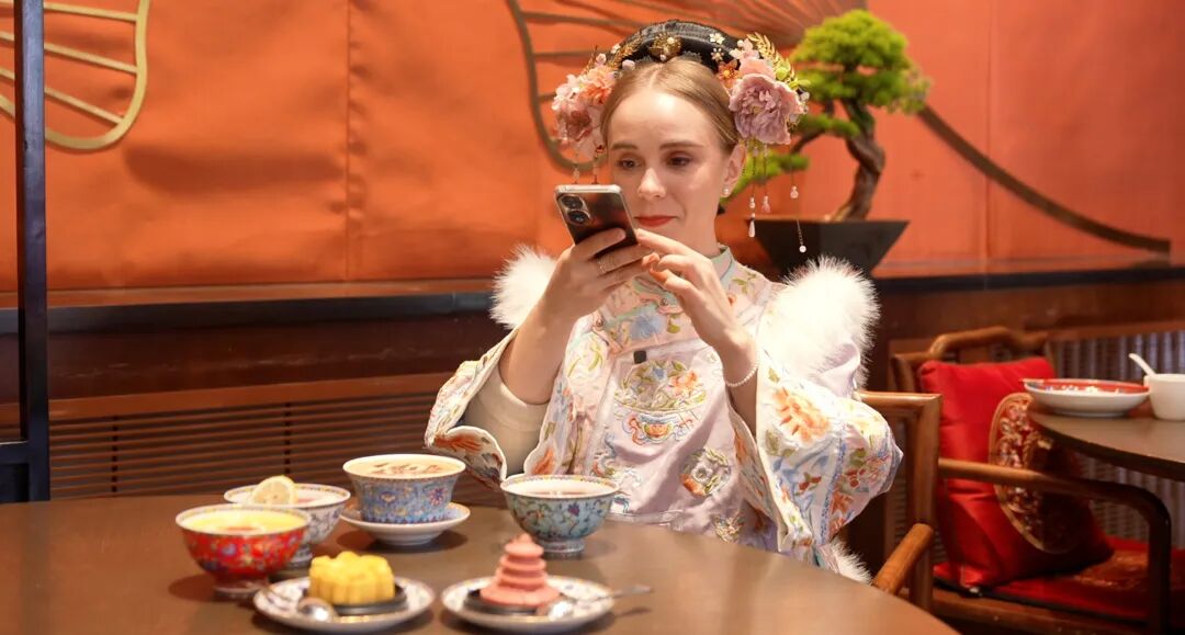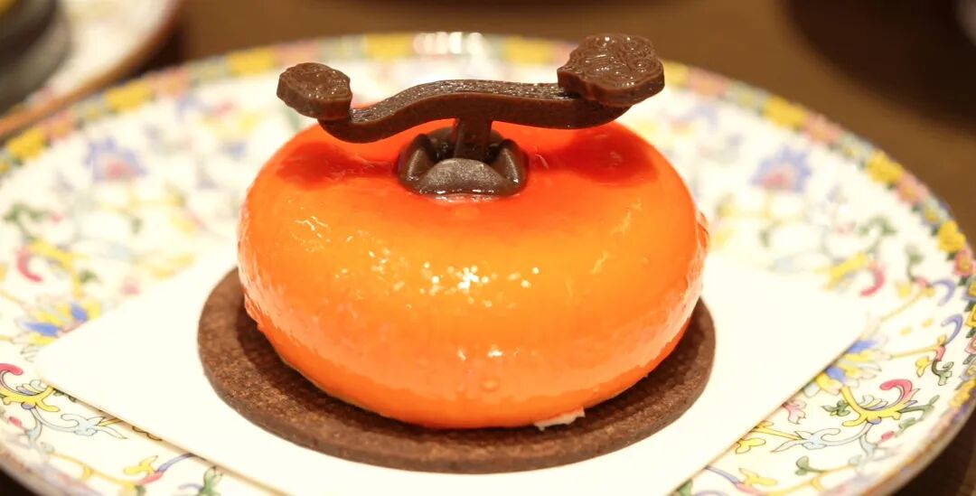 身穿格格旗装的店员为安格丽娜端上热门的“柿柿如意”。这款甜品以惟妙惟肖的柿子造型和顶部“如意”样式的巧克力,传达了“事事如意”的美好祝福,其精致又可爱的造型让安格丽娜一见倾心。