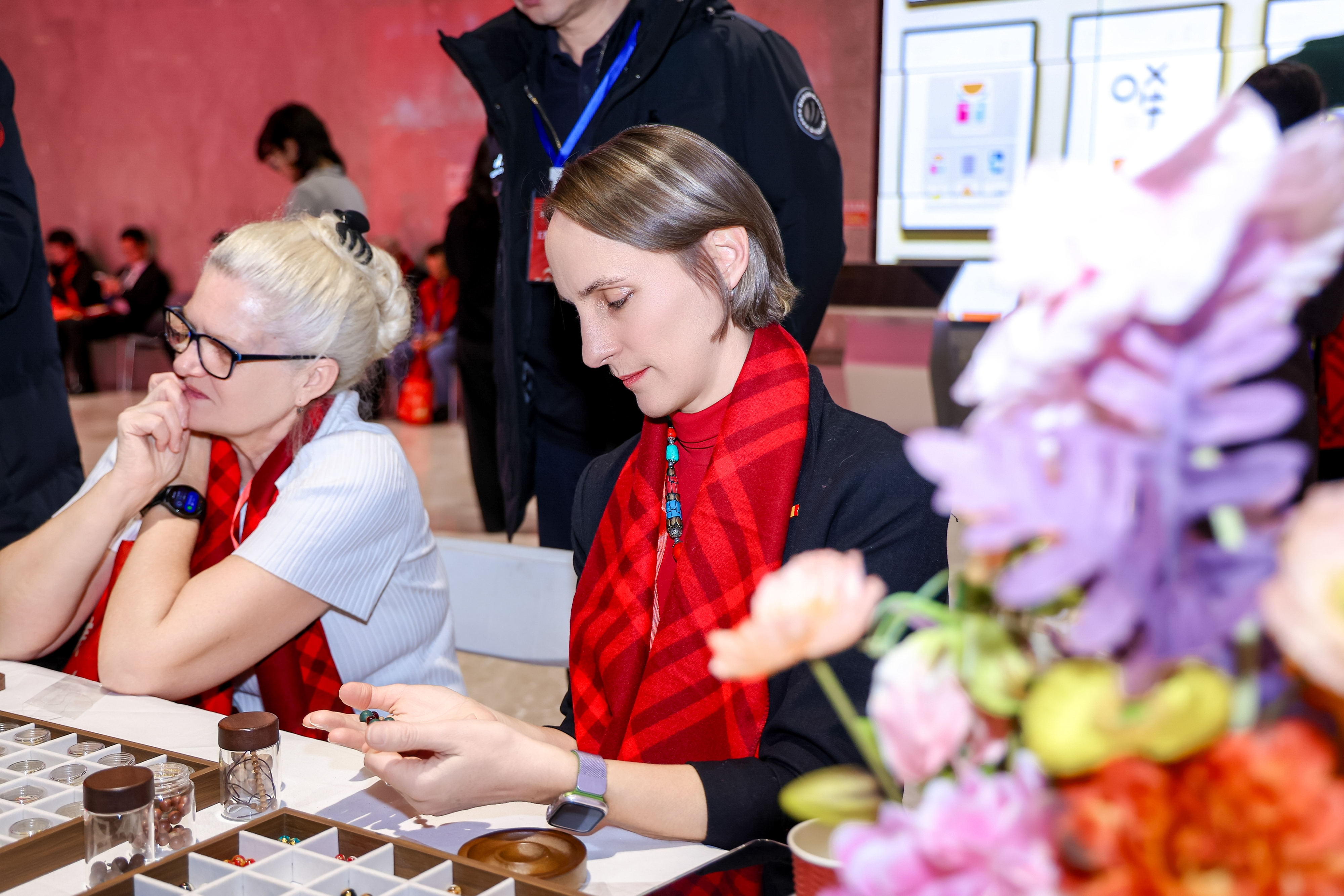 在非遗体验区域,外籍专家沉浸式体验竹叶书、内画、串珠手作、京点品鉴等中国传统文化与美食。国家级非遗项目北京兔儿爷(泥彩塑)备受关注,外籍专家涂出造型威武可爱、寓意吉祥平安的北京兔儿爷。东城区级非遗项目北京剪纸传承人,中国高级工艺美术师徐阳先生以京味民俗、京剧脸谱、吉祥纹样为题材指导外籍专家剪裁特色图案。现场热闹喜庆,洋溢着节日氛围。非遗体验期间,中外嘉宾还集体参观了全球吉庆生肖设计大赛邀请展,领略了生肖文化和创意设计的融合之美。