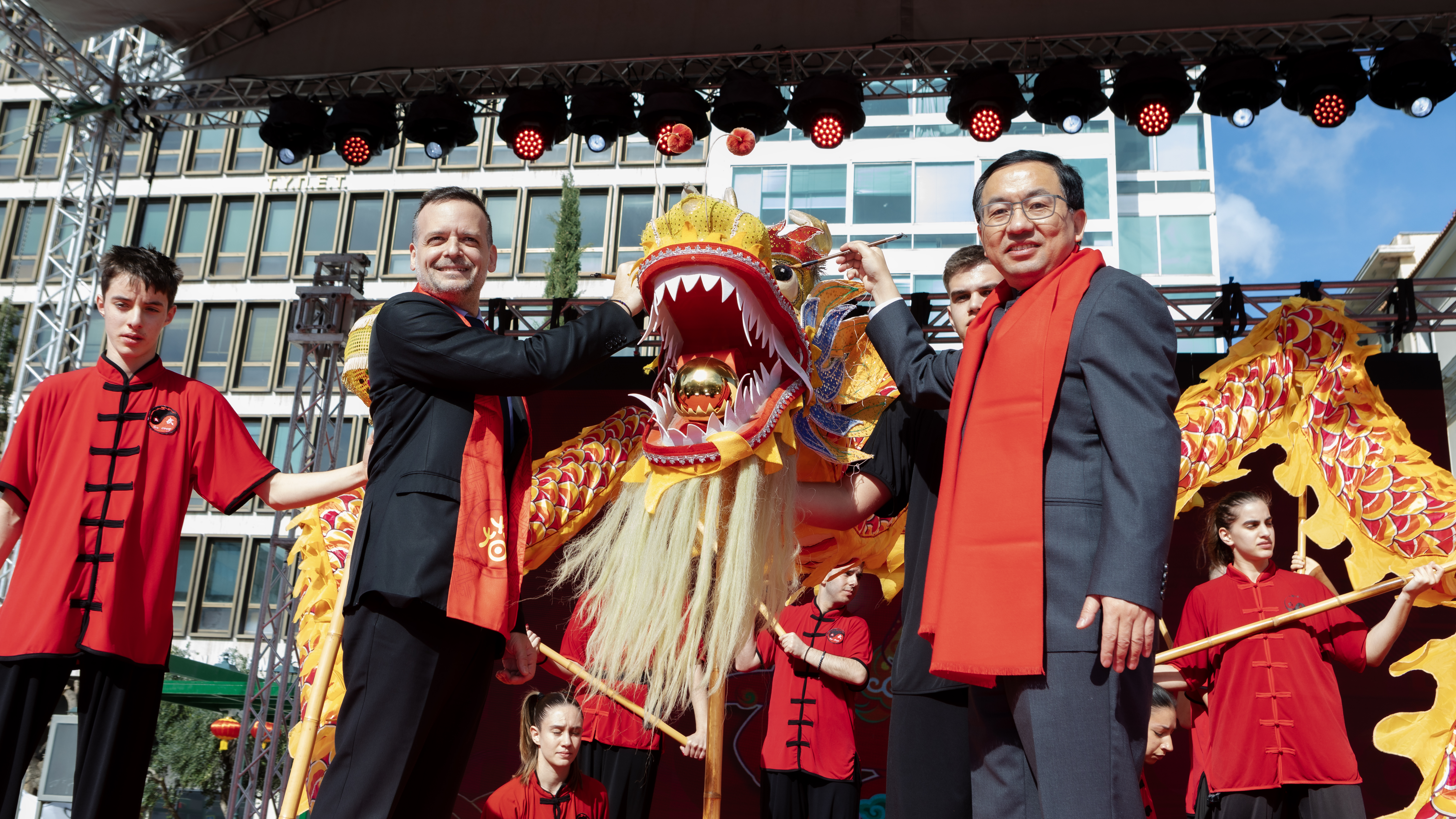 欢乐春节活动现场,中国驻希腊大使方遒、希腊社会凝聚和家庭事务部长米哈伊利祖、雅典市市长哈里斯·杜卡斯。比雷埃夫斯市市长亚尼斯·莫拉利斯及北京代表团团长王鑫等嘉宾出席并致辞,深情回顾“欢乐春节”在希腊的十年历程,高度肯定其在促进民心相通与文明互鉴中的重要作用,表达继续深化中希文化合作、共谱友好新篇的期待,并向两国民众送上新春祝福。
