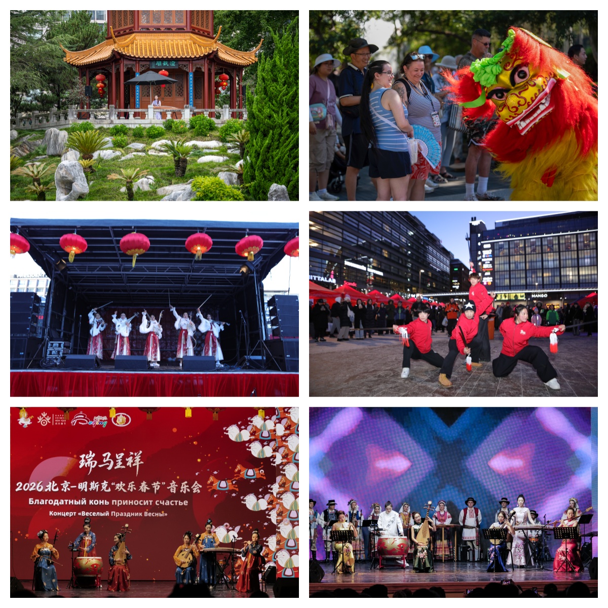多场精品文艺演出跨越山海、联通中外,向世界传递中国文化的深厚底蕴与独特魅力。纽约总领馆展演《花好月圆》等经典,街头快闪尽显文化活力;希腊剧院内,《一马当先》《天女散花》上演,中希艺术家共谱互鉴之歌;悉尼谊园将演出与园林景致相融,总领馆招待会同步呈现精品表演,全方位向世界展现中国文化的独特魅力;芬兰赫尔辛基KAMPPI广场演出以新民乐《一马当先》拉开帷幕,校园内同步开展京剧、民乐等特色表演及沉浸式互动体验,让中国韵味浸润青年心灵;明斯克新春音乐会以《春日序曲》启幕,中白艺术家共奏友谊乐章;墨西哥国家艺术中心,中墨艺术家联袂登台,琵琶合奏、武术《武魂》、呼麦与马头琴《万马奔腾》等节目轮番上演;吉隆坡TRX广场,中马艺术家带来8小时汇演,舞狮《马到成功贺新春》将南北狮融合,独唱《一线中轴百世缘》展现北京中轴线风采,中马民乐合奏《赛马》将现场气氛推向高潮;莫斯科市中心的马涅什广场新春庙会,民乐、武术、杂技轮番登场,融合中俄元素的《卡林卡》成为全场亮点。