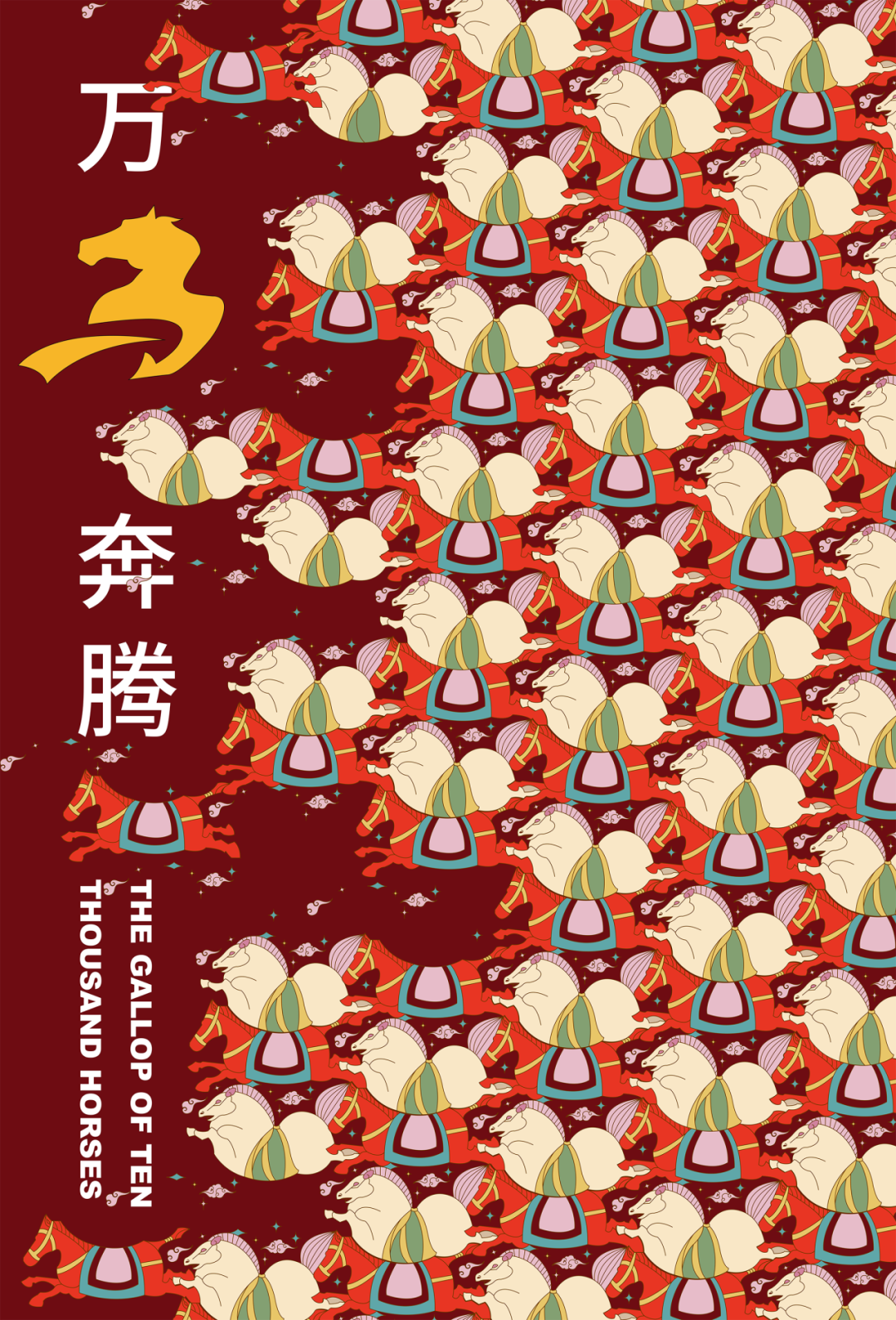 将两匹马组合后,设计师使用密铺图形的设计,让无数马形互为基底又彼此推动,构建出万马奔腾的壮阔场景。奔腾的马群象征着当代青年勇往直前、不畏挑战的蓬勃力量,也传递出蓬勃昂扬的旺盛生命力。