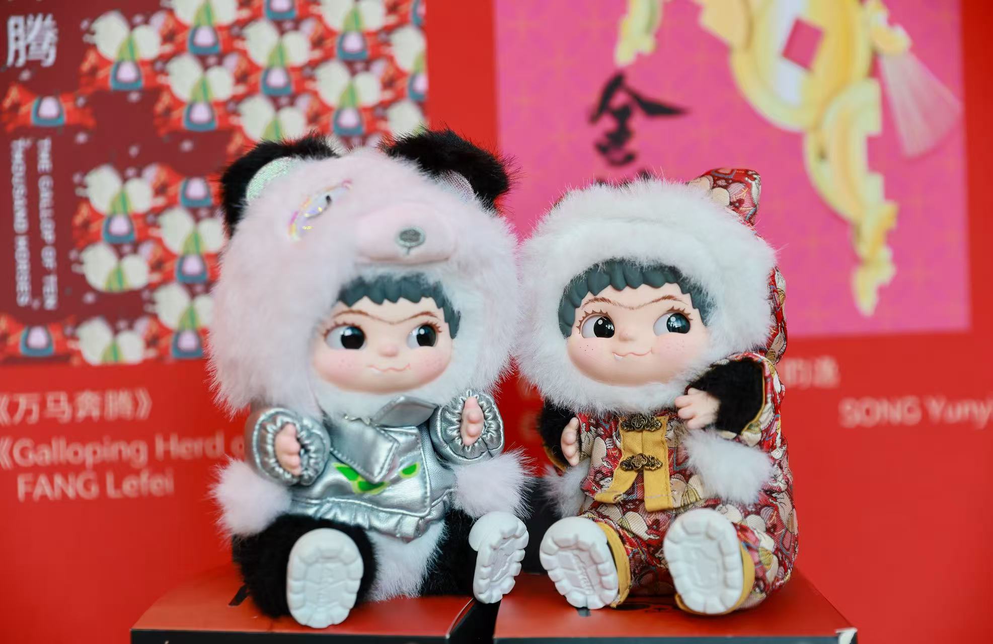 娃衣以国家级非遗宋锦精心制作,宋锦质地细腻挺括、色泽温润雅致,素有“锦绣之冠”的美誉,承载着千年丝织技艺的深厚底蕴。衣身之上,《万马奔腾》的吉祥马纹栩栩如生,将骏马昂扬奋进的气势与忠诚坚毅的品格织入丝锦,既延续了宋锦千年传承的匠心工艺,又为潮玩注入了厚重的文化内涵。明艳而不失雅致的国风配色,既贴合当代年轻群体的审美,又尽显传统工艺的典雅质感,赢得了世界各地观众的喜爱与热烈反响。