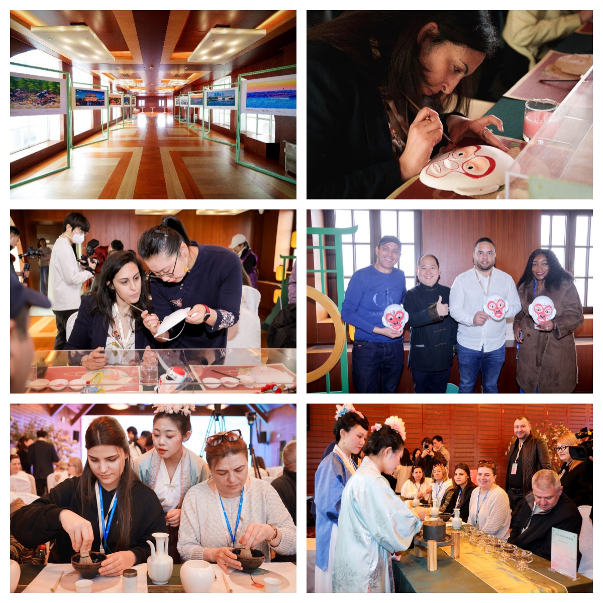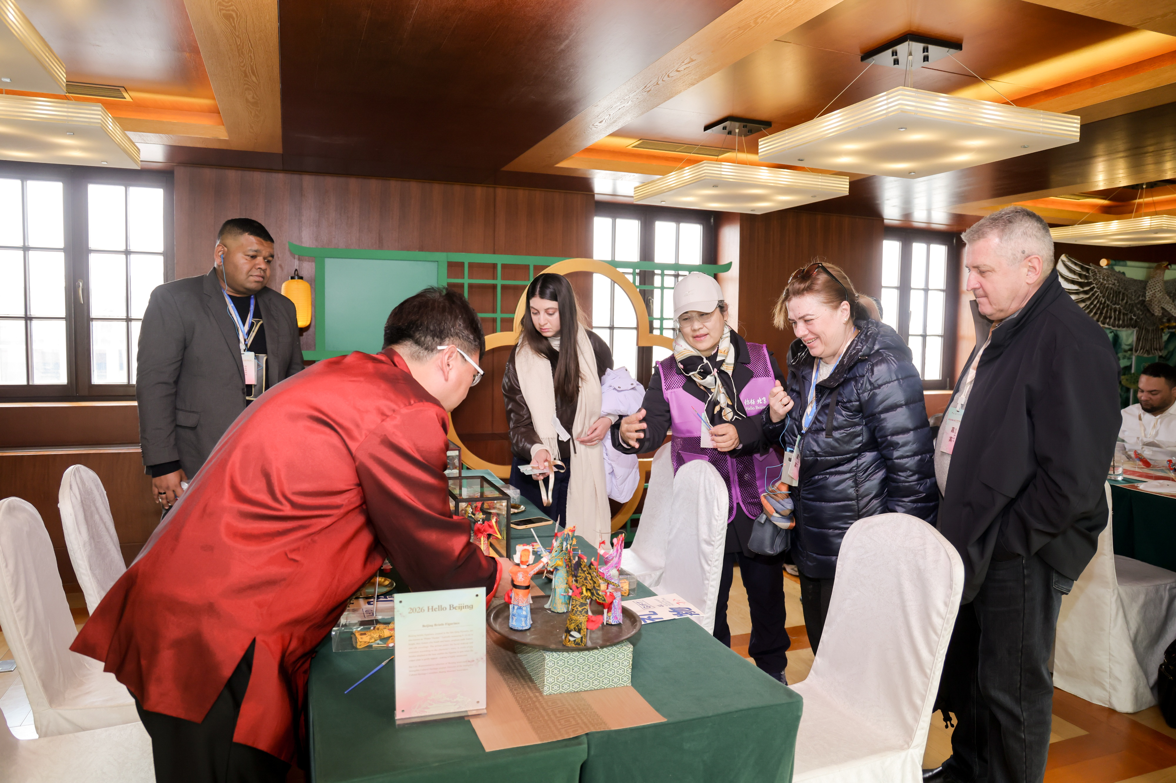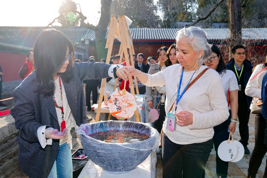 活动现场还设置了“你好,北京”图片展,为各国嘉宾生动呈现北京古今交融的城市景观。宋式点茶、彩塑京剧脸谱、北京鬃人、金氏风筝等非遗体验让各国使节沉浸式感受中国传统技艺的魅力。