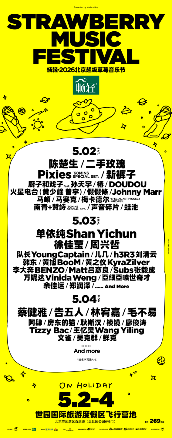 2026年5月2日-4日,一场盛大的城市狂欢正在集结。这里有躁动的音浪、炙热的舞台和自由的灵魂。涵盖流行、摇滚、电子、民谣等多元曲风,国内外一线音乐人、乐队与潮流艺人,三大舞台同步开唱。一起尽情摇摆,大声歌唱,在这个春天创造独属于你的炽热记忆。2026北京超级草莓音乐节,邀你不见不散!